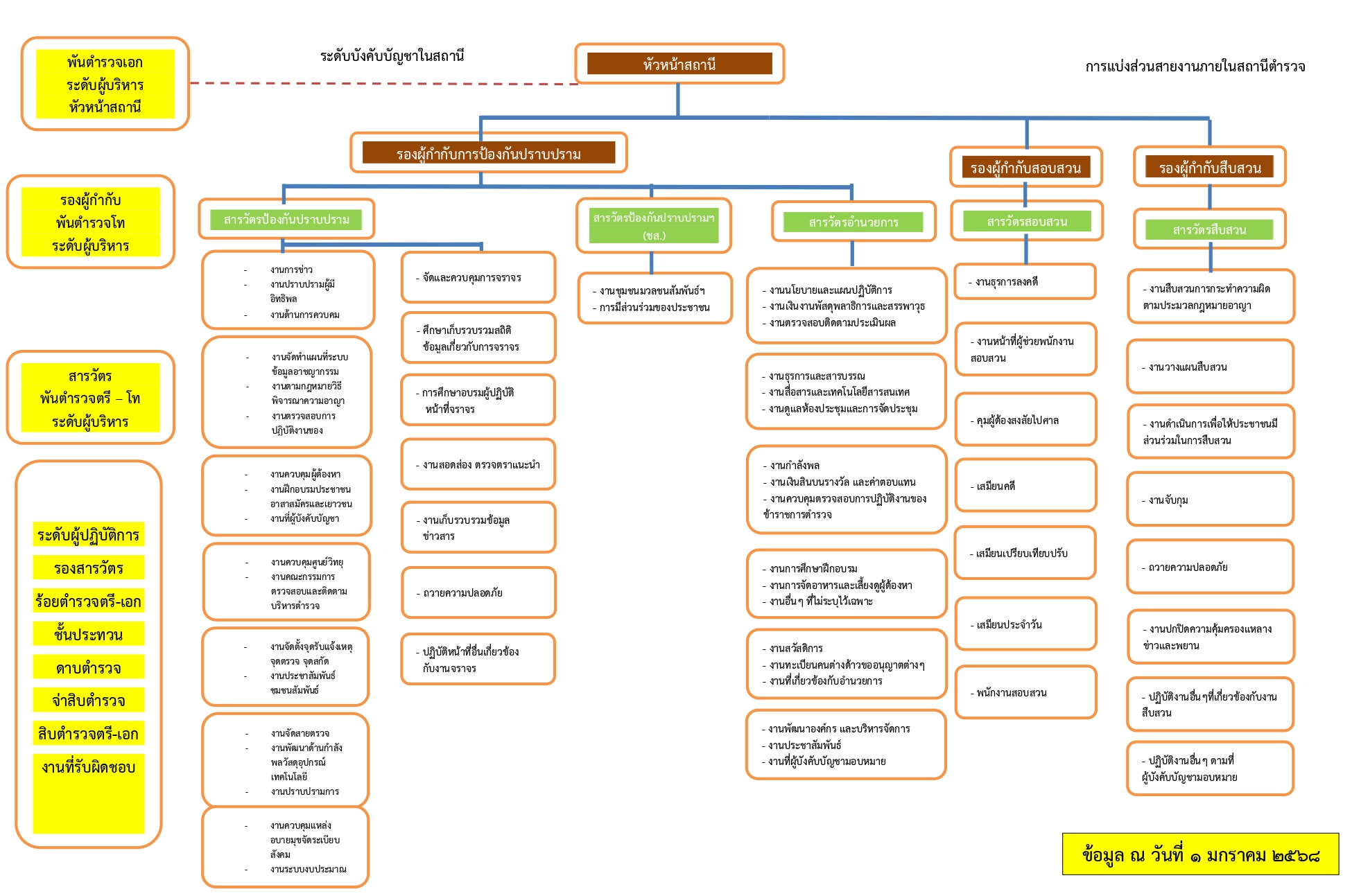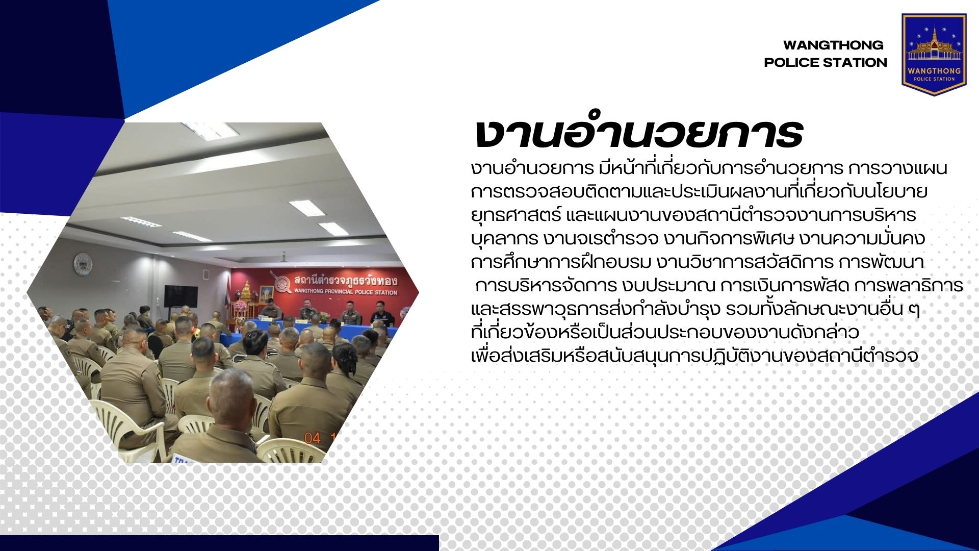 มีหน้าที่เกี่ยวกับการอำนวยการ การวางแผน การตรวจสอบติดตามและประเมินผลงานที่เกี่ยวกับนโยบาย ยุทธศาสตร์ และแผนงานของสถานีตำรวจ งานการบริหารบุคลากร งานจเรตำรวจงานกิจการพิเศษ งานความมั่นคง การศึกษา การฝึกอบรม งานวิชาการ สวัสดิการ การพัฒนา การบริหารจัดการ งบประมาณ การเงิน การพัสดุ การพลาธิการและสรรพาวุธ การส่งกำลังบำรุง รวมทั้งลักษณะงานอื่น ๆ ที่เกี่ยวข้องหรือเป็นส่วนประกอบของงานดังกล่าว เพื่อส่งเสริมหรือสนับสนุนการปฏิบัติงานของสถานีตำรวจ