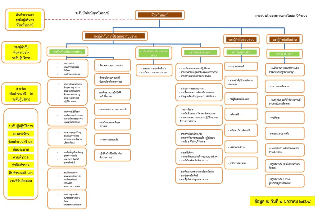 มีหน้าที่เกี่ยวกับการวางแผน อำนวยการ สั่งการ ควบคุม กำกับ ดูแล ตรวจสอบติดตามและประเมินผล ตลอดจนปฏิบัติงานในด้านการป้องกันอาชญากรรมและรักษาความสงบเรียบร้อยงานคณะกรรมการตรวจสอบและติดตามการบริหารงานตำรวจ งานชุมชนและมวลชนสัมพันธ์ในรูปแบบต่าง ๆ รวมทั้งงานที่มีลักษณะเกี่ยวข้องหรือเป็นส่วนประกอบของงานนี้ เพื่อมิให้เกิดอาชญากรรมขึ้นในเขตอำนาจ การรับผิดชอบหรือพื้นที่ปกครองของสถานีตำรวจ